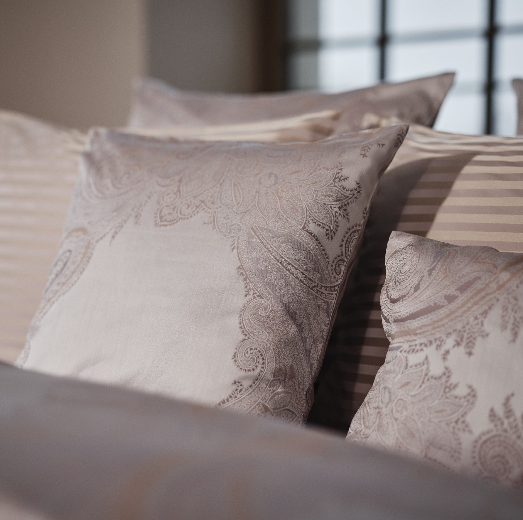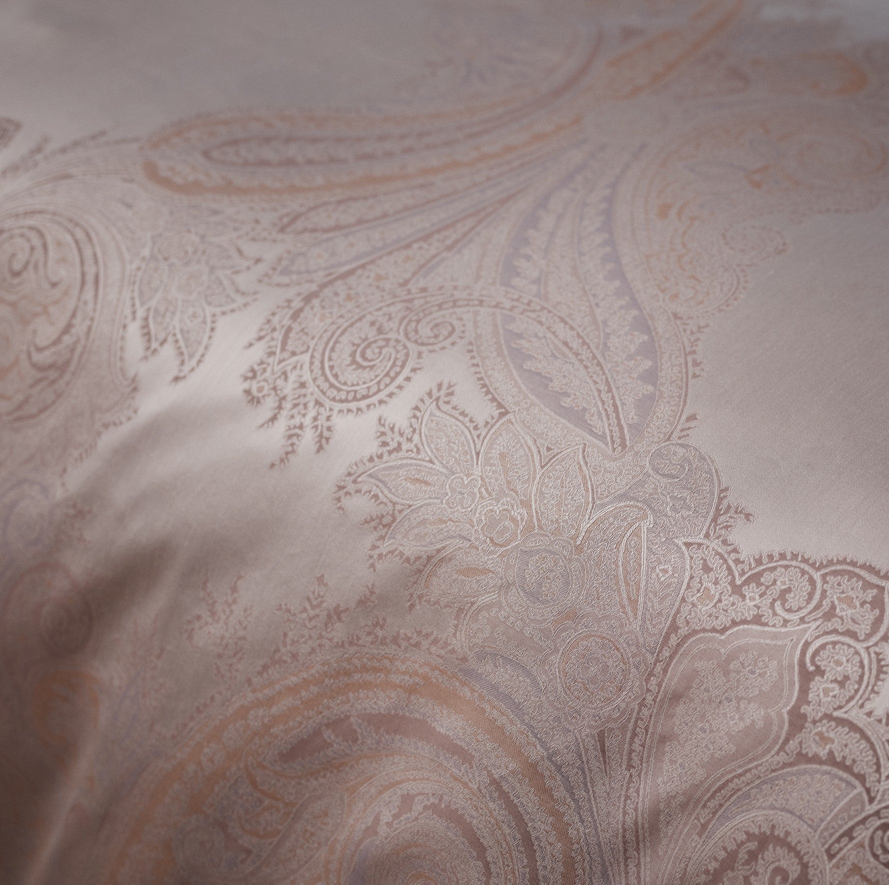 Grace ist ein Glanzstück der Jacquard Weberei von aller höchster Qualität und handwerklichem Geschick. Das prachtvolle, wunderschöne Paisley Motiv wird in Italien von einer der besten Webereien in Gold-, Silber-, und Rosé-Schattierungen hergestellt. Kett- und Schussfarben sind so raffiniert verwoben, dass ein tiefer, vielfarbiger Effekt mit luxuriösester Wirkung entsteht.