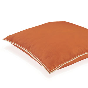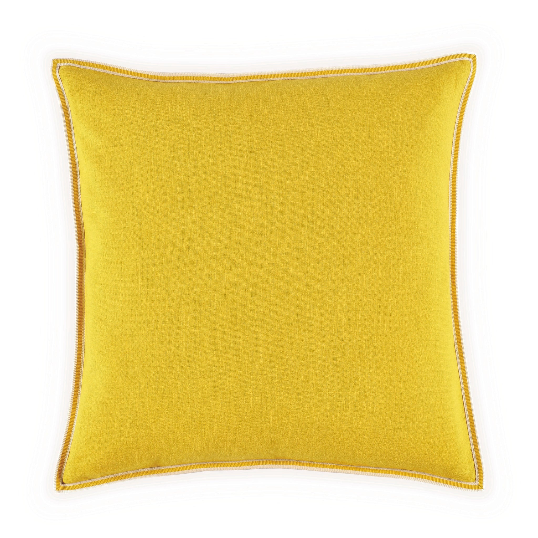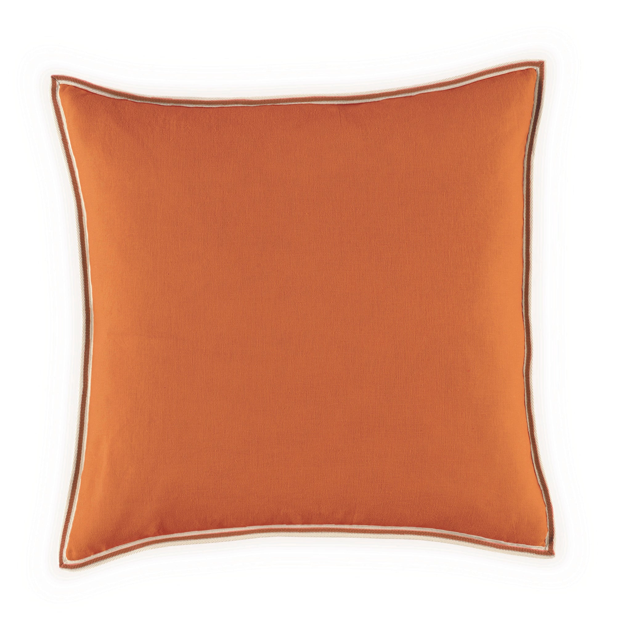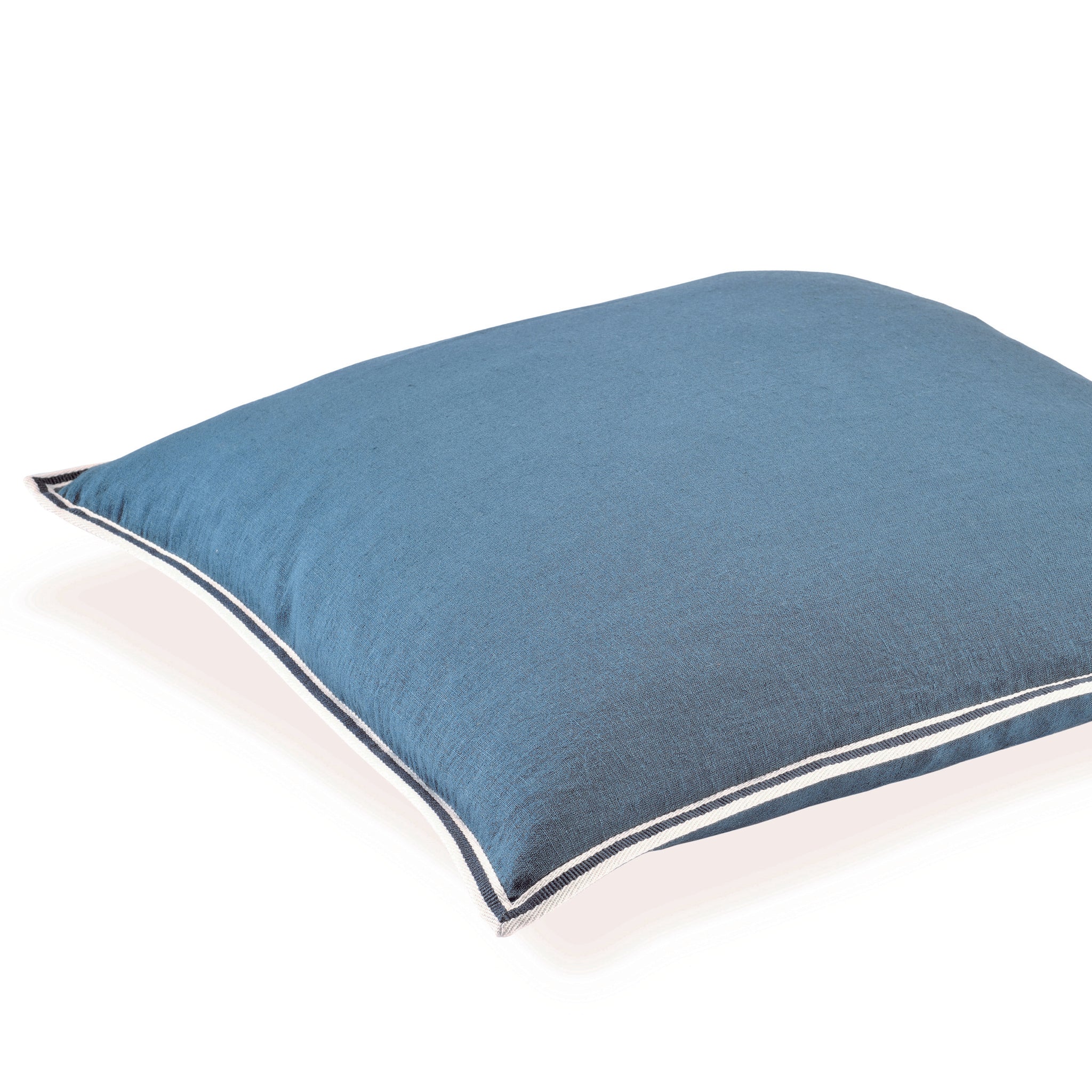 Kissenbezug aus stonewashed Baumwolle, gefüttert mit gewaschenem Baumwoll-Voile und mit einem verdeckten Reißverschluss verarbeitet. Das schlichte Kissen erhält durch eine helle Borte eine besondere, sportliche Optik.